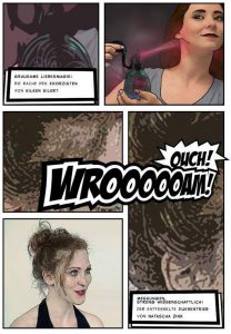 Was bringt uns zum Lachen? Was ist komisch? Wodurch zeichnet sich eine Komödie aus? Und was unterscheidet sie von einem Comic? – In Zusammenarbeit mit einer Schauspielklasse von der HfMDK Frankfurt und dem Hessischen Rundfunk erarbeiteten Medien-Studierenden aus ganz Hessen kleine Szenen, die an bekannte Comics anknüpfen: ihre Charaktere, Inhalte und komisch-komödiantischen, dramaturgischen Prinzipien.
