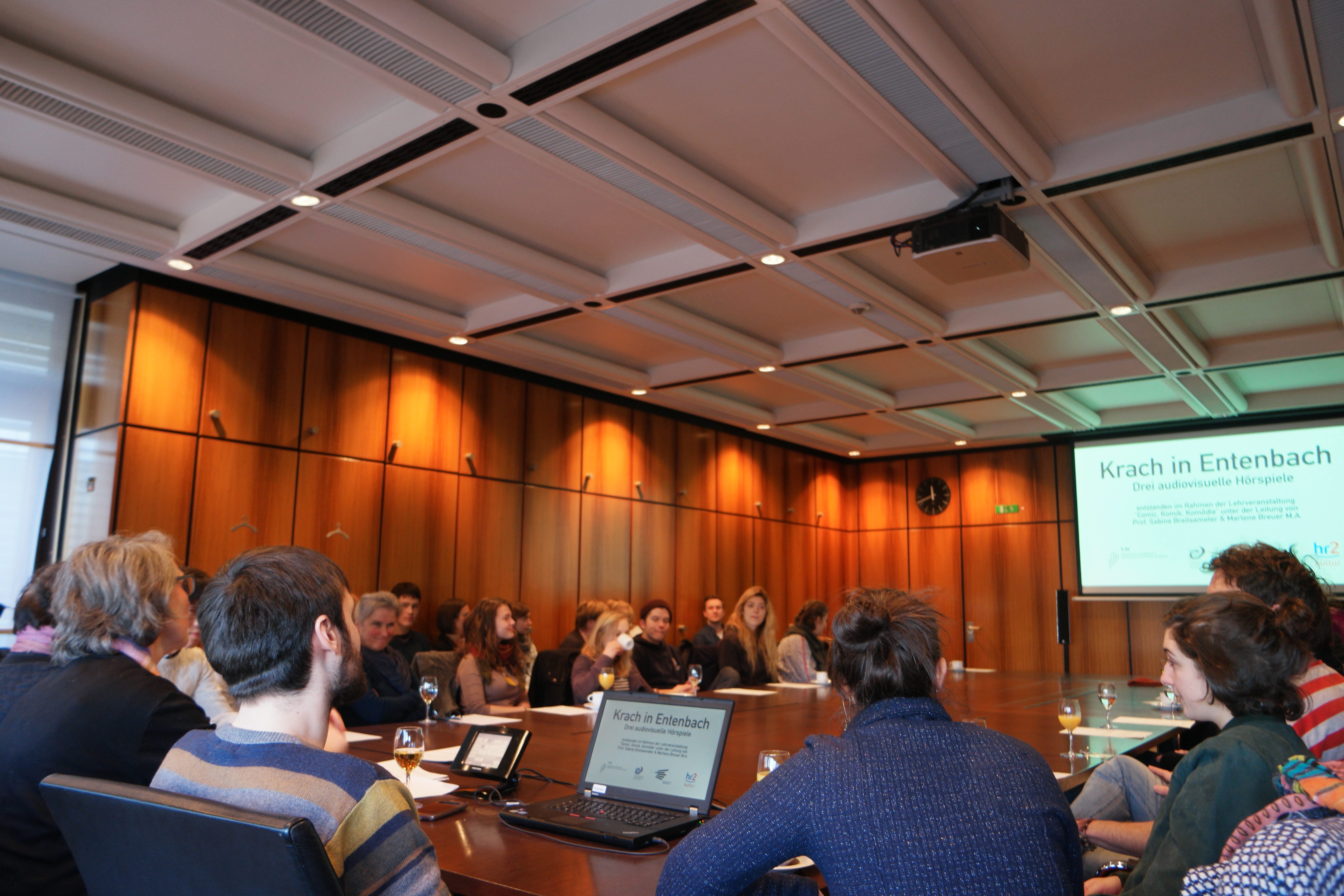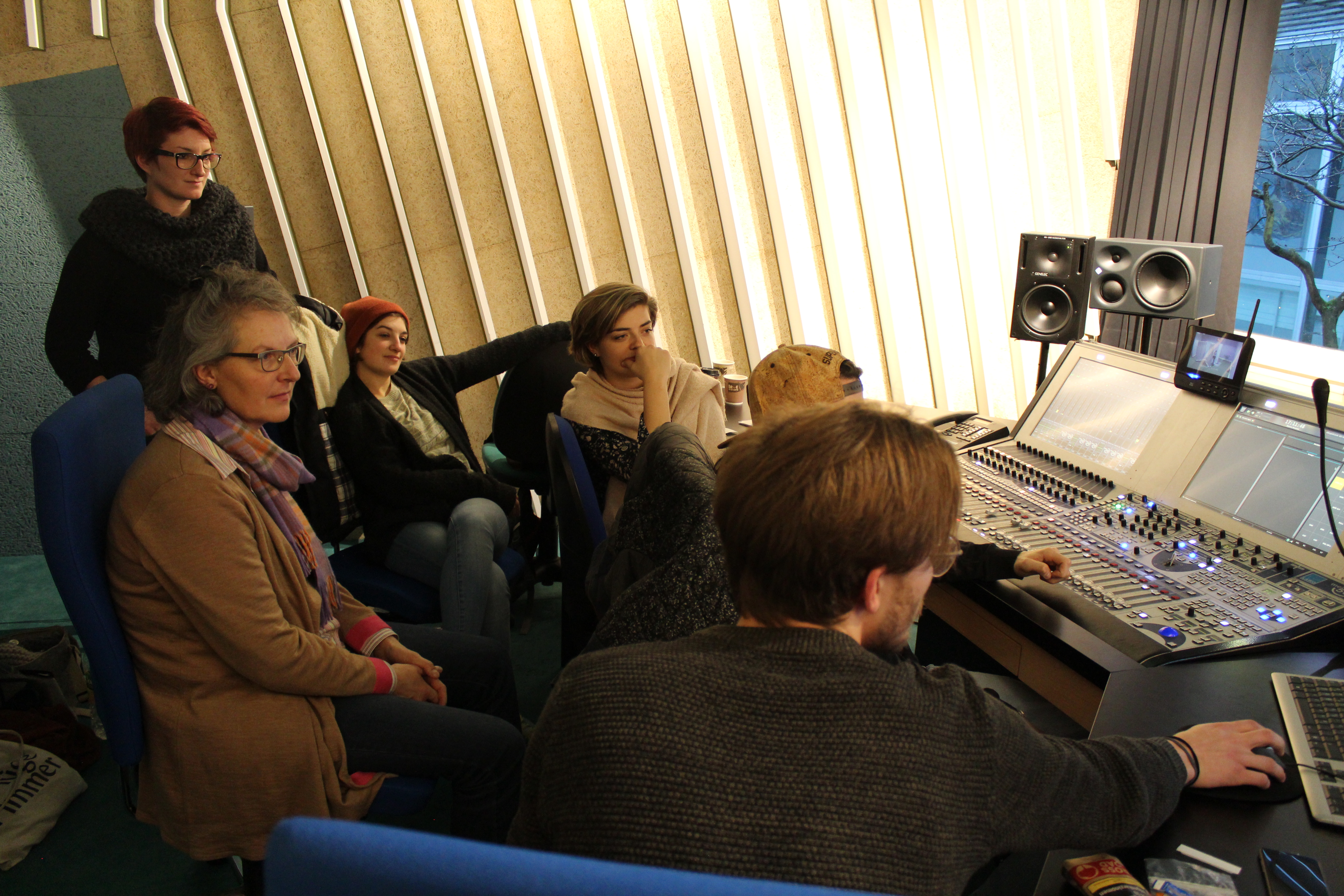 Gearbeitet wurde dabei in trans- und interdisziplinären Produktionsteams. Vielfache Blicke über den Tellerrand, spannende Begegnungen mit Kommilitonen und interessante, professionelle Kontakte für die Teilnehmer/innen waren unausweichlicher Teil des Programms! Dabei sammelten viele Teilnehmer ihre ersten Erfahrungen in ihrer Rolle als Regissuer / Regisseurin, Regieassistent / Regieassistentin, Tontechniker / Tontechnikerin oder als Visual-Artist bei der Gestaltung der visuellen Komponente der Hörspiele. Dabei wurden die Fragen zur dramaturgischen Einbindung und zur ästhetische Ausgestaltung der „Stills“ in Einzelgesprächen und Coachings diskutiert – immerhin beschritten die Teilnehmer hier Neuland. Eine besondere Herausforderung lag darin, den Kursteilnehmern, die zum Teil keine Vorerfahrung in ihrem Aufgabenbereich hatten, in kurzer Zeit das nötige Know-How zu vermitteln, oder – wo nötig – zur rechten Zeit die helfende Hand an die Seite zu stellen, um ein professionelles und hochwertiges Ergebnis zu erzielen.